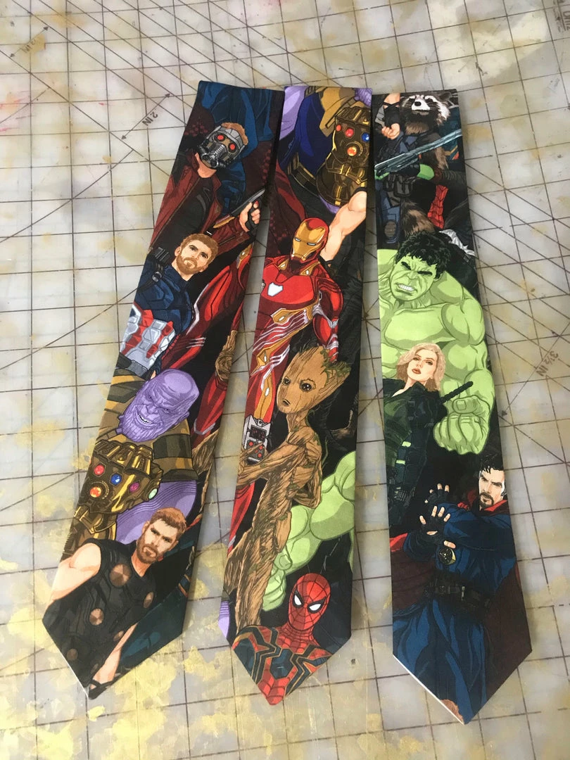 Marvel Comic Avengers Infinity Wars necktie in bow tie, skinny tie, or standard tie styles, and kids or adult sizes. Pick which character you’d like centered, choose from Thanos, Groot, Hulk, or your favorite. Adult Marvel Comic tie is self-tie, sized to 16.5″, custom length available at no charge. Kids Marvel Avengers bow tie comes pre-tied, and has back elastic to allow it to slip over the head. Please see chart below for full necktie and bow tie sizing for children and adults.