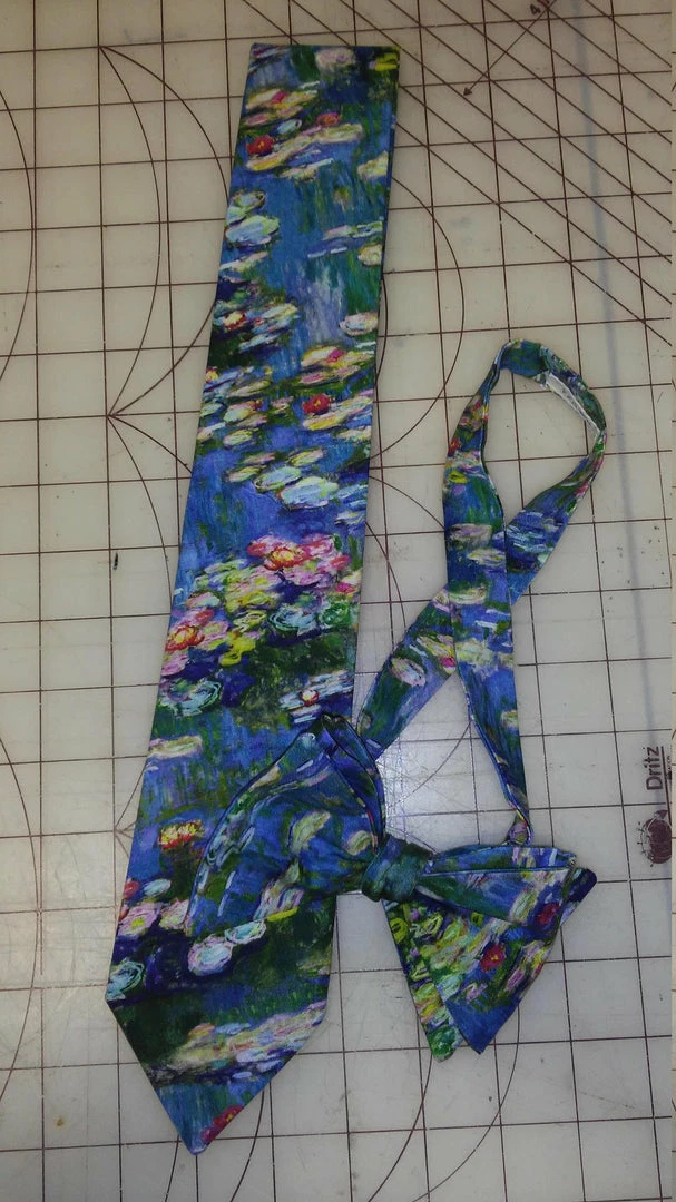Monet Water Lillies Watercolor necktie in bow tie, skinny tie, or standard tie styles, and kids or adult sizes. Adult Monet Water Lillies Watercolor tie is self-tie, sized to 16.5″, custom length available at no charge. Kids Monet Water Lillies Watercolor bow tie comes pre-tied, and has back elastic to allow it to slip over the head. Please see chart below for full necktie and bow tie sizing for children and adults.
