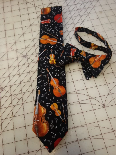 Cello and Violin necktie in bow tie, skinny tie, or standard tie styles, and kids or adult sizes. Adult Cello and Violin bow tie is self-tie, sized to 16.5″, custom length available at no charge. Kids Cello and Violin bow tie comes pre-tied, and has back elastic to allow it to slip over the head. Please see chart below for full necktie and bow tie sizing for children and adults.