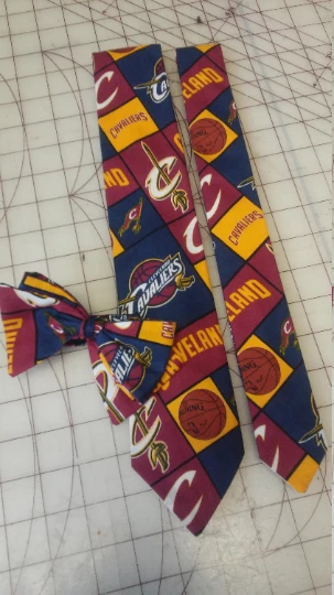 Cleveland Cavaliers NBA wine and gold necktie in bow tie, skinny tie, or standard tie styles, and kids or adult sizes. Adult Cleveland Cavaliers bow tie is self-tie, sized to 16.5″, custom length available at no charge. Kids Cleveland Cavaliers bow tie comes pre-tied, and has back elastic to allow it to slip over the head. Please see chart below for full necktie and bow tie sizing for children and adults.
