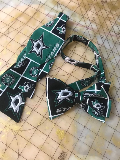 Dallas Stars NHL necktie in bow tie, skinny tie, or standard tie styles, and kids or adult sizes. Adult Dallas Stars bow tie is self-tie, sized to 16.5″, custom length available at no charge. Kids bow tie comes pre-tied, and has back elastic to allow it to slip over the head. Please see chart below for full necktie and bow tie sizing for children and adults.