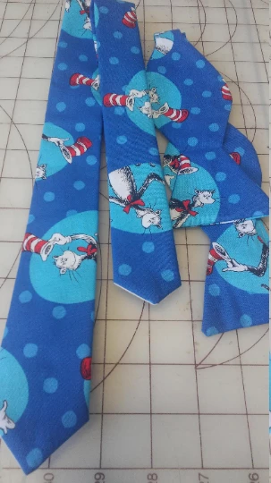 Dr Seuss Cat in the Hat necktie in bow tie, skinny tie, or standard tie styles, and kids or adult sizes. Adult Dr Seuss Cat in the Hat bow tie is self-tie, sized to 16.5″, custom length available at no charge. Kids bow tie comes pre-tied, and has back elastic to allow it to slip over the head. Please see chart below for full necktie and bow tie sizing for children and adults.