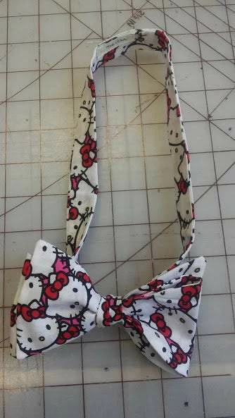 Hello Kitty Necktie in bow tie, skinny tie, or standard tie styles, and kids or adult sizes. Adult Hello Kitty bow tie is self-tie, sized to 16.5″, custom length available at no charge. Kids’ bow tie comes pre-tied, and has back elastic to allow it to slip over the head. Please see chart below for full necktie and bow tie sizing for children and adults.