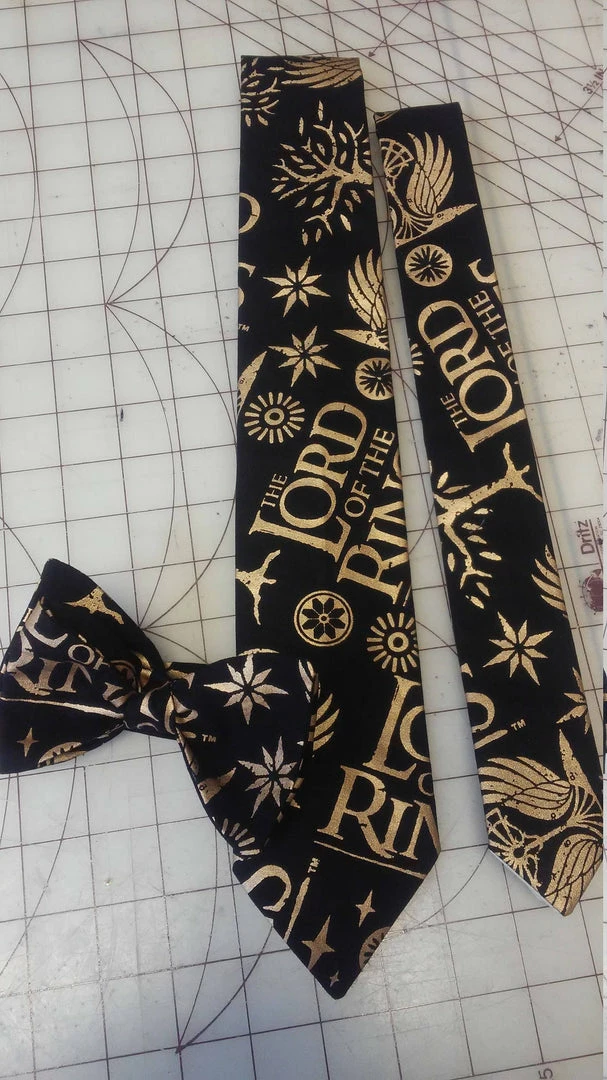 Lord of the Rings necktie in bow tie, skinny tie, or standard tie styles, and kids or adult sizes. Adult Lord of the Rings tie is self-tie, sized to 16.5″, custom length available at no charge. Kids Lord of the Rings bow tie comes pre-tied, and has back elastic to allow it to slip over the head. Please see chart below for full necktie and bow tie sizing for children and adults.