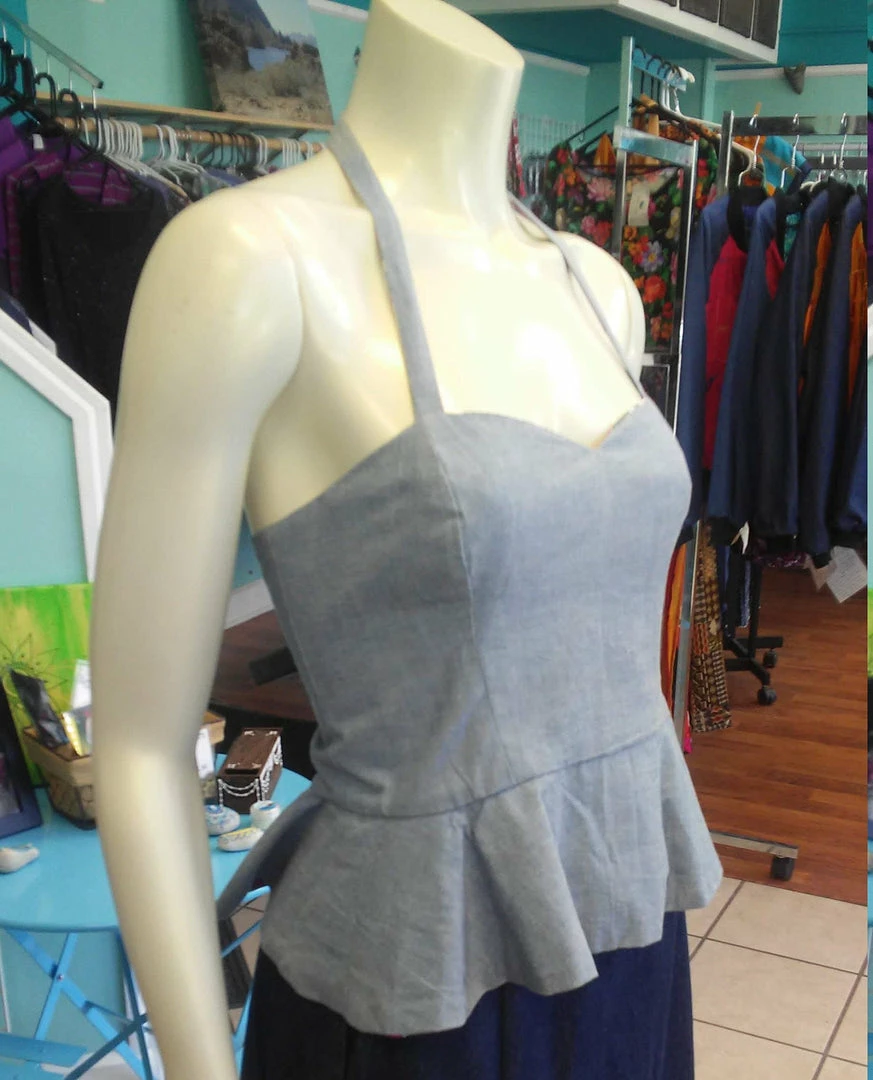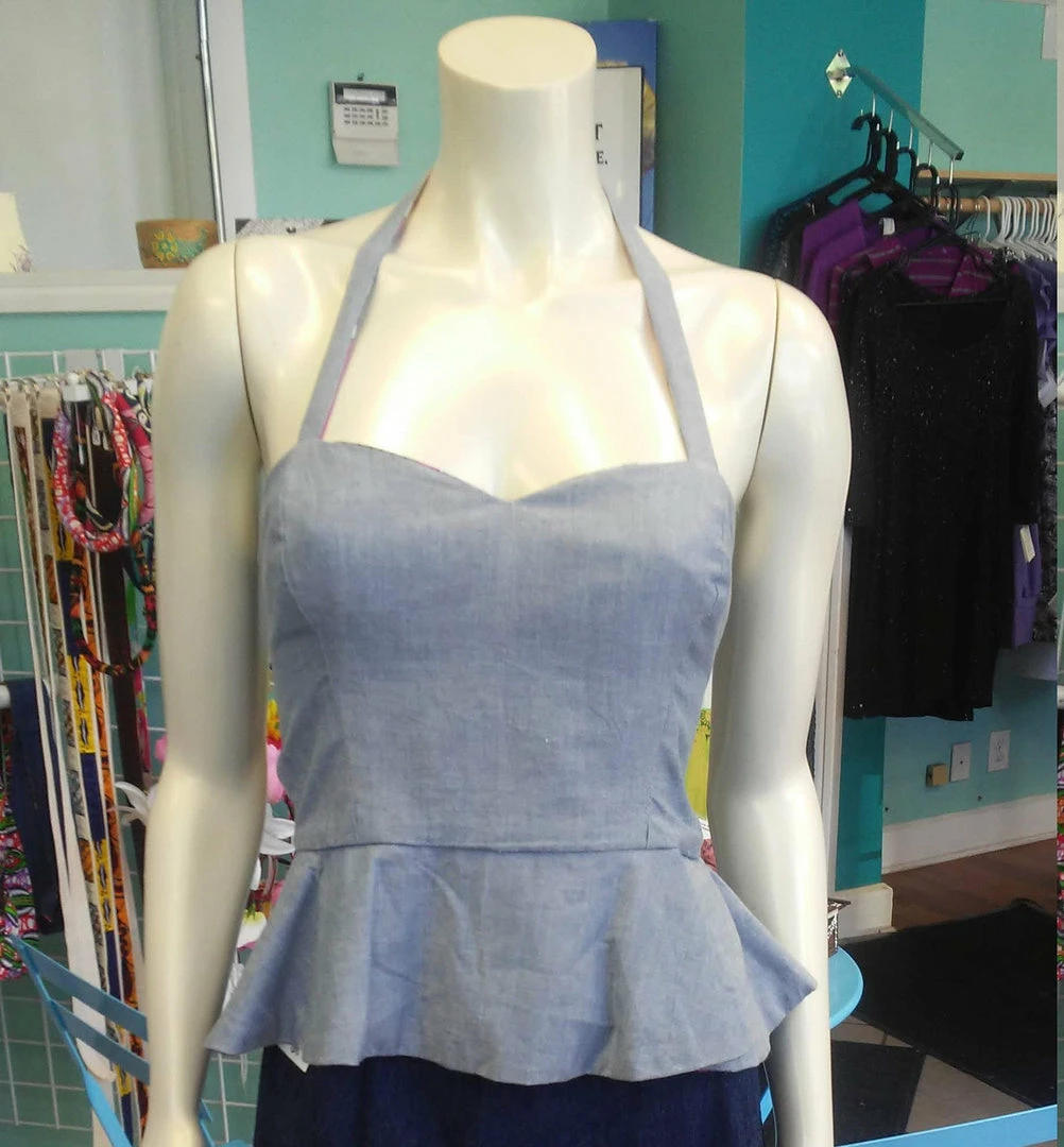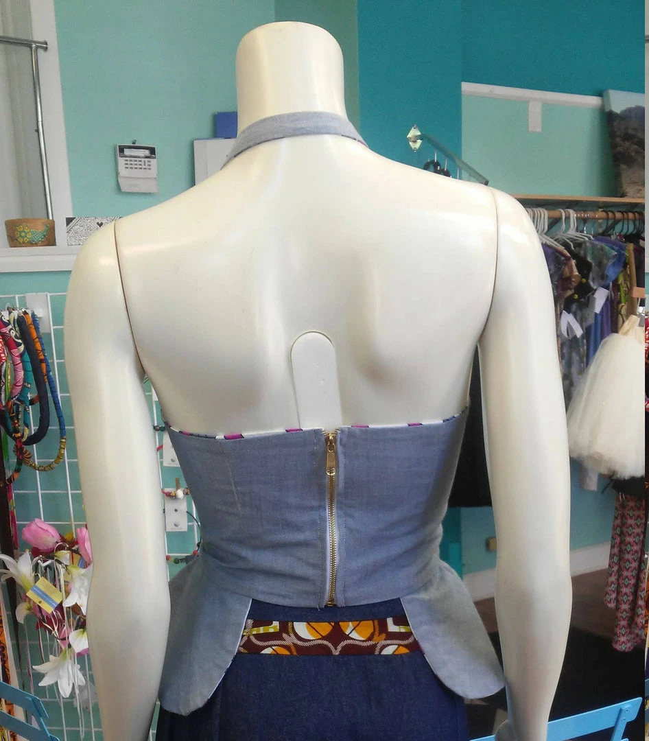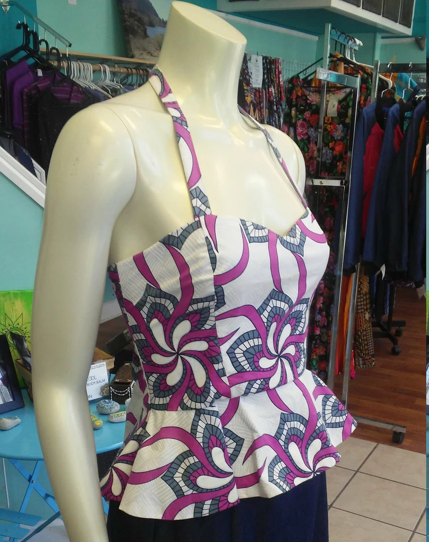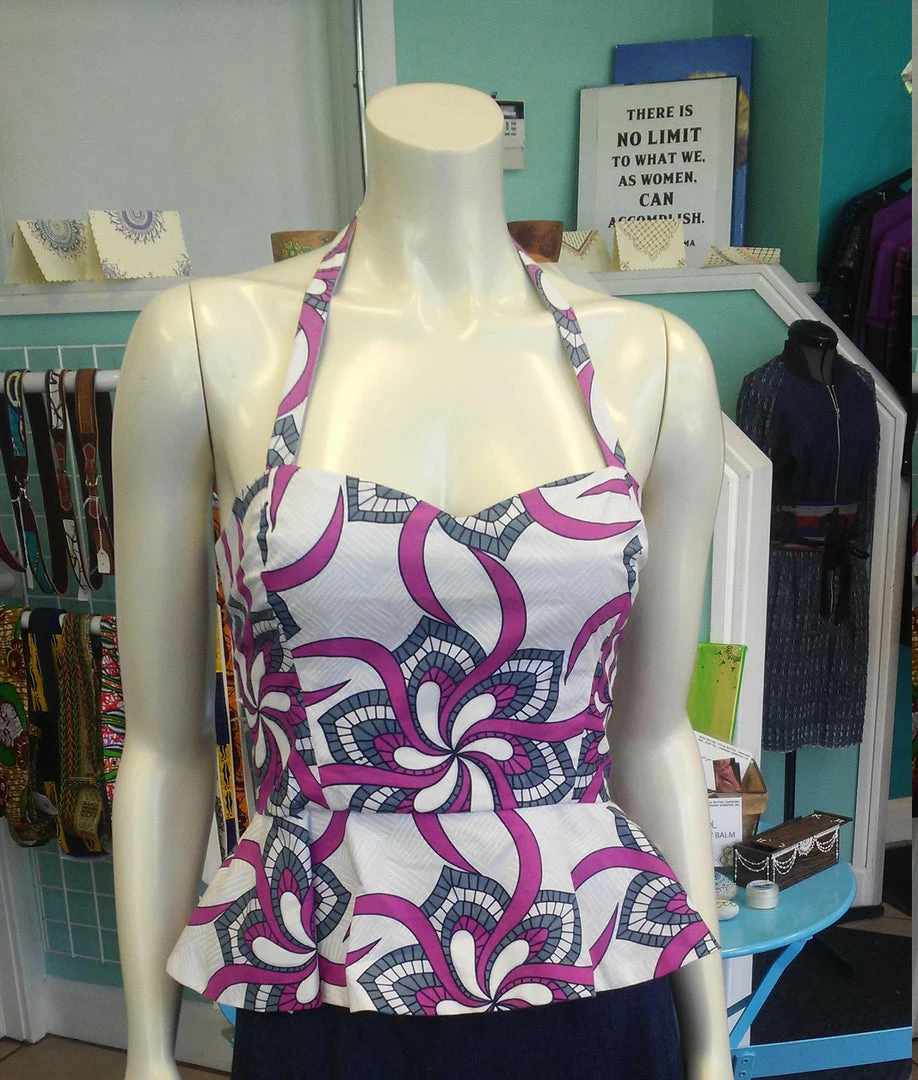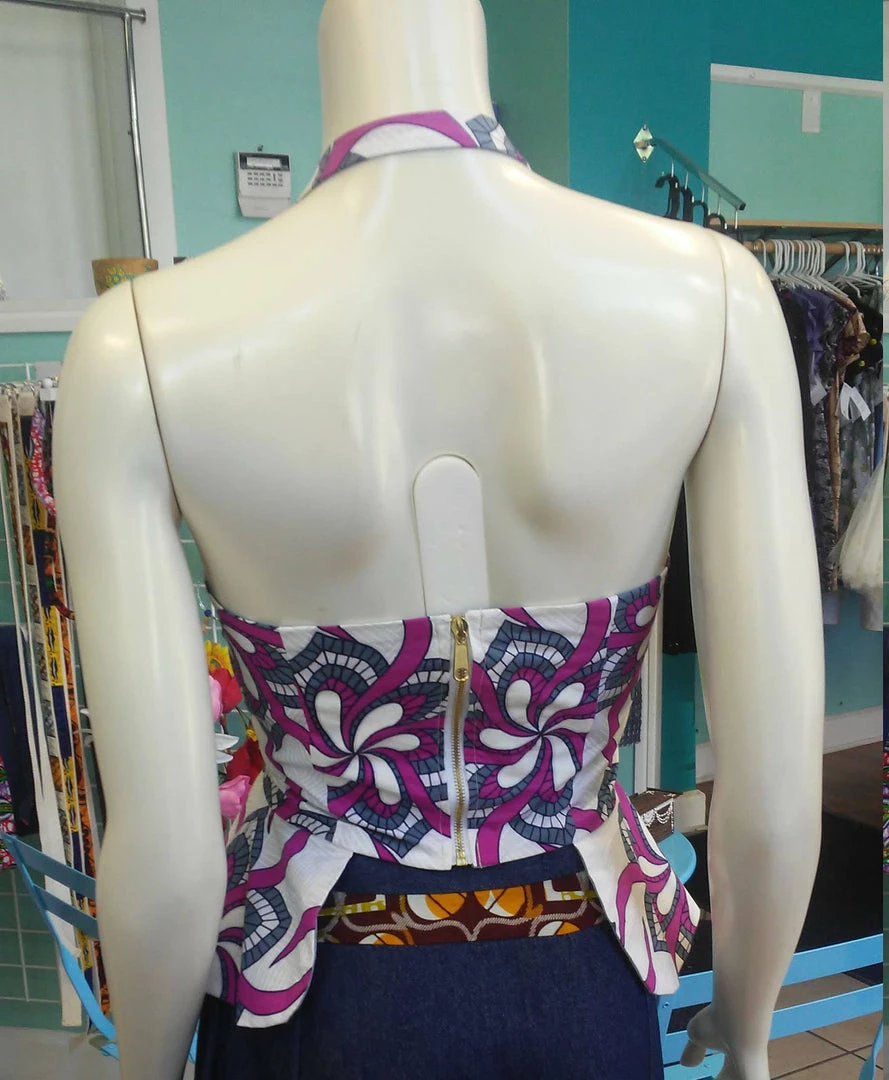 Reversible peplum top in purple and white ankara print and denim. Midriff length with circle peplum and neck strap.
