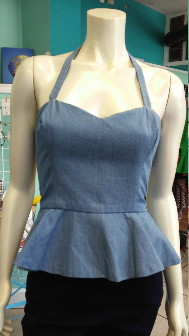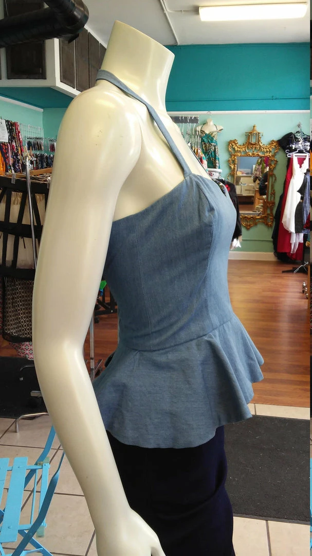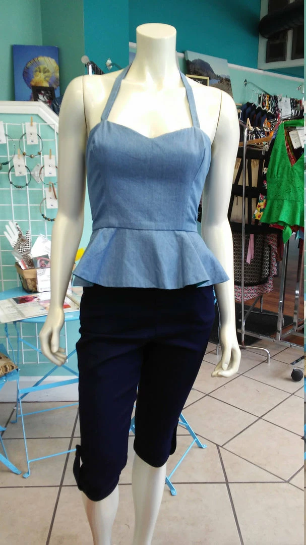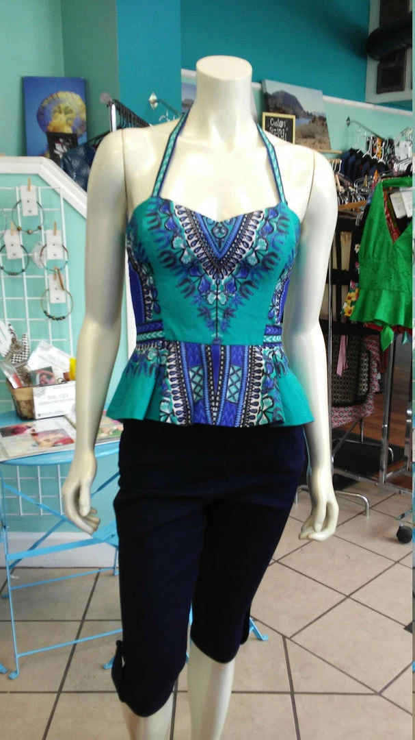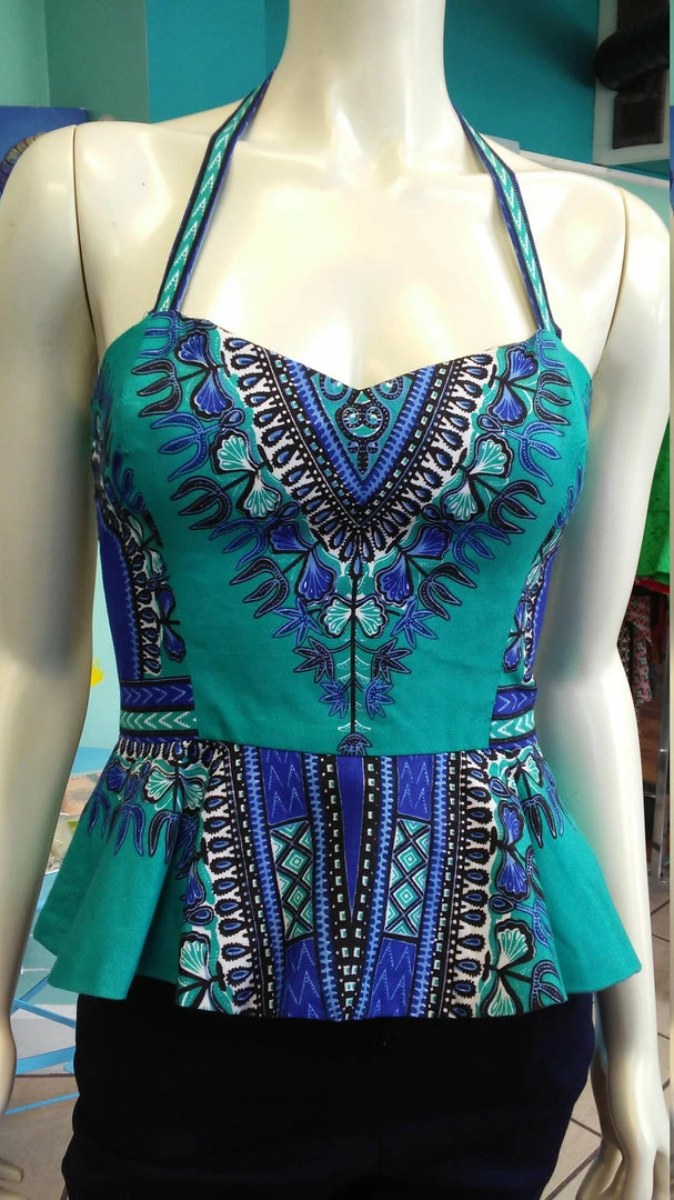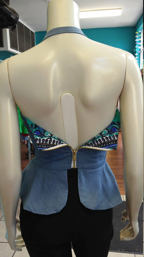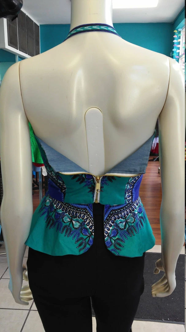 Reversible peplum top in teal and blue dashiki print and denim. Midriff length with circle peplum and neck strap. Only one available! (unzipped to show both prints)