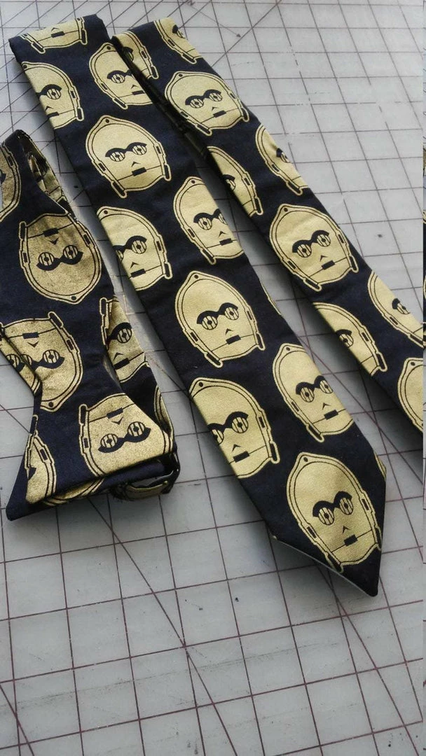Star Wars C3PO necktie in bow tie, skinny tie, or standard tie styles, and kids or adult sizes. Adult Star Wars bow tie is self-tie, sized to 16.5″, custom length available at no charge. Kids Star Wars C3PO bow tie comes pre-tied, and has back elastic to allow it to slip over the head. Please see chart below for full necktie and bow tie sizing for children and adults.