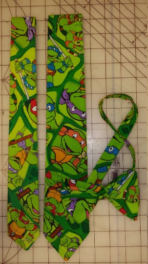 Teenage Mutant Ninja Turtle necktie in bow tie, skinny tie, or standard tie styles, and kids or adult sizes. Adult Teenage Mutant Ninja Turtle bow tie is self-tie, sized to 16.5″, custom length available at no charge. Kids TMNT bow tie comes pre-tied, and has back elastic to allow it to slip over the head. Please see chart below for full necktie and bow tie sizing for children and adults.
