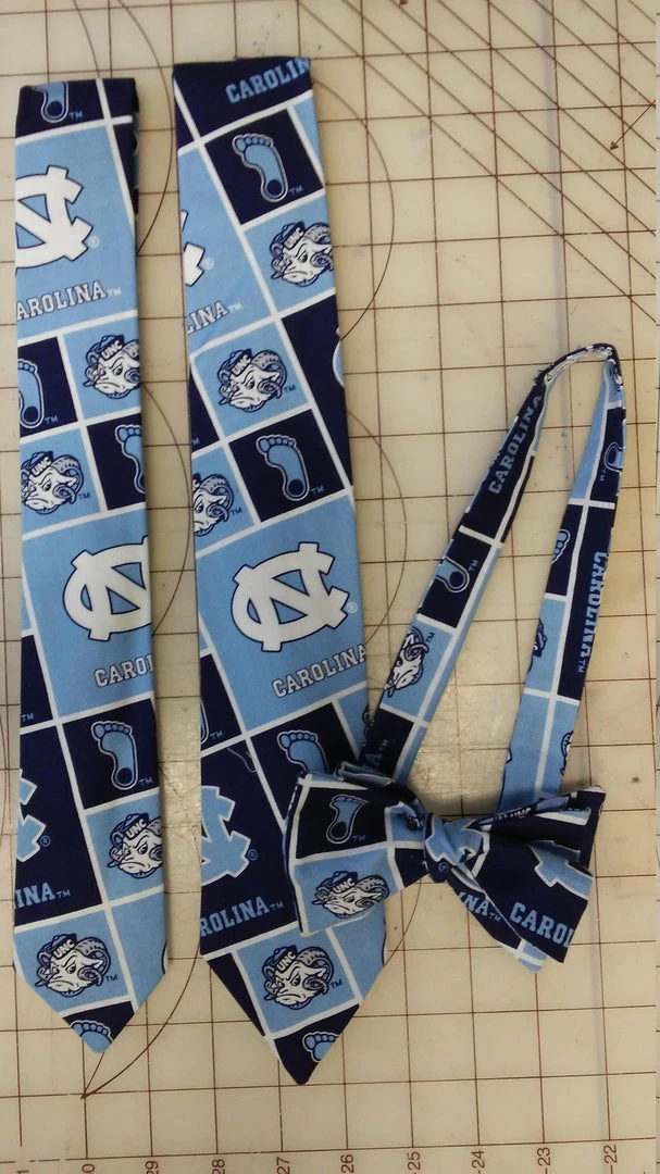 University of North Carolina Tar Heels necktie in bow tie, skinny tie, or standard tie styles, and kids or adult sizes. Adult University of North Carolina Tar Heels bow tie is self-tie, sized to 16.5″, custom length available at no charge. Kids University of North Carolina Tar Heels bow tie comes pre-tied, and has back elastic to allow it to slip over the head. Please see chart below for full necktie and bow tie sizing for children and adults.
