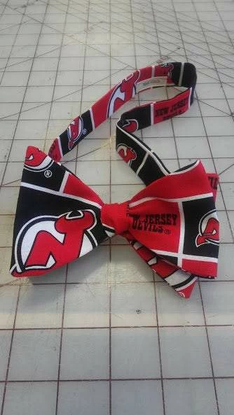 New Jersey Devils NHL necktie in bow tie, skinny tie, or standard tie styles, and kids or adult sizes. Adult New Jersey Devils bow tie is self-tie, sized to 16.5″, custom length available at no charge. Kids New Jersey Devils bow tie comes pre-tied, and has back elastic to allow it to slip over the head. Please see chart below for full necktie and bow tie sizing for children and adults.