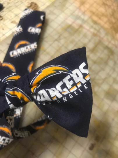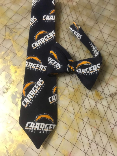 NFL San Diego Chargers Necktie in bow tie, skinny tie, or standard tie styles, and kids or adult sizes. Adult Chargers bow tie is self-tie, sized to 16.5″, custom length available at no charge. Kids Chargers bow tie comes pre-tied, and has back elastic to allow it to slip over the head. Please see chart below for full necktie and bow tie sizing for children and adults.