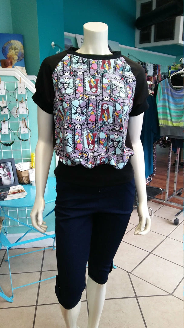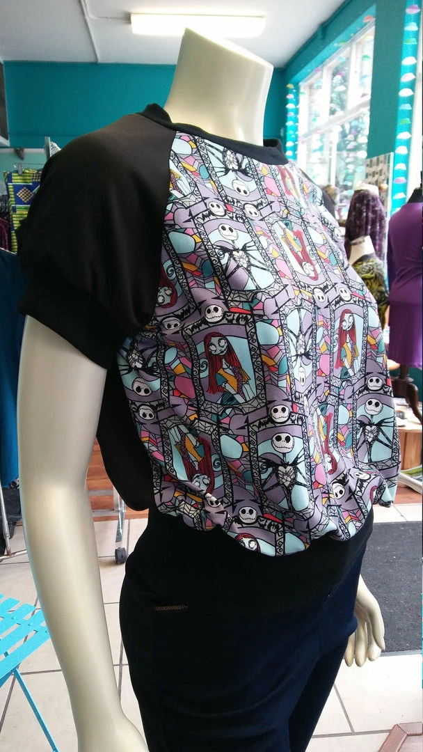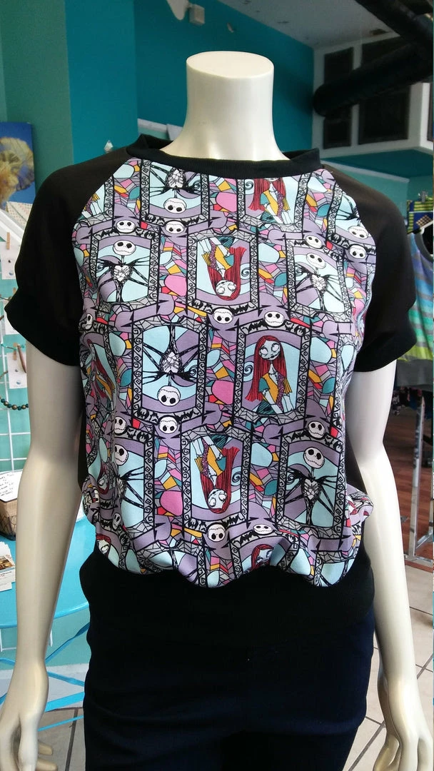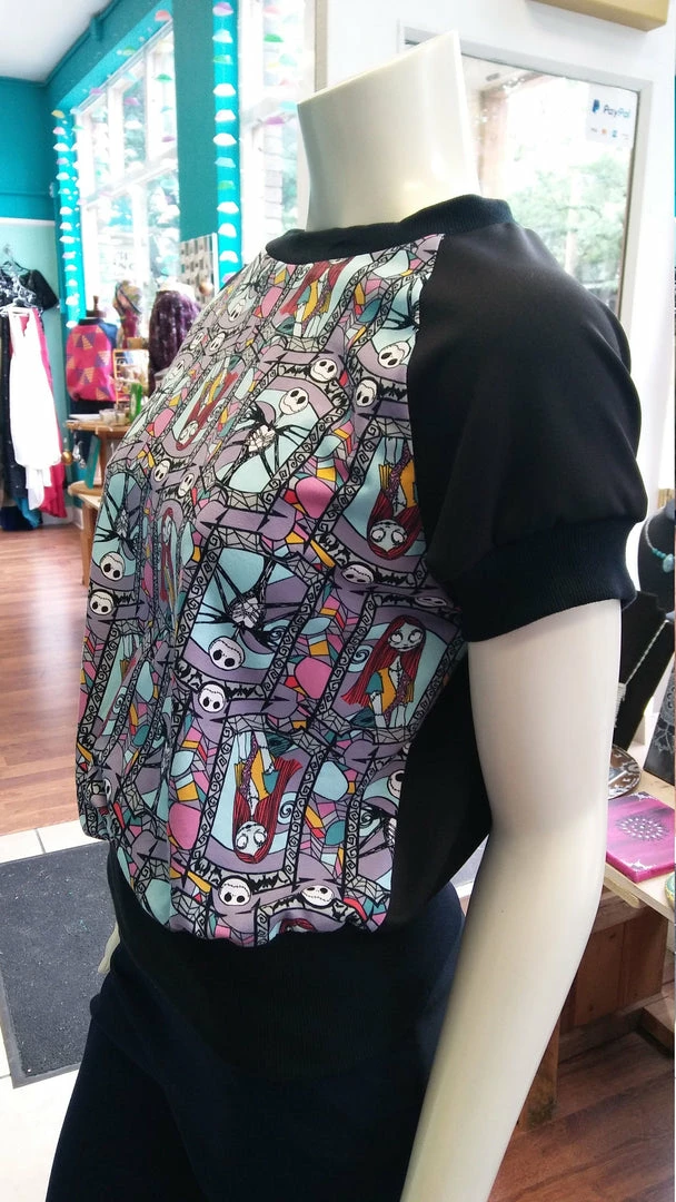 At the intersection of comfort and fandom, this versatile Nightmare Before Christmas pullover will step up your casual wardrobe. Made from knit pint featuring Jack Skellington and Sally, along with black jersey. Neck, sleeves and waist are finished with black cuff ribbing. Easy care, machine cold. Part of the Tidal Cool Geek Chic collection.