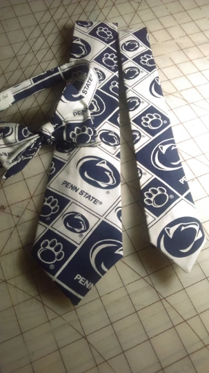 Penn State University necktie in bow tie, skinny tie, or standard tie styles, and kids or adult sizes. Adult Penn State University bow tie is self-tie, sized to 16.5″, custom length available at no charge. Kids Penn State University bow tie comes pre-tied, and has back elastic to allow it to slip over the head. Please see chart below for full necktie and bow tie sizing for children and adults.