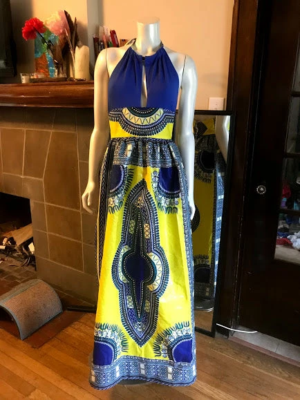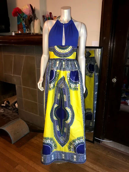 Halter maxi dress, in blue and yellow dashiki print. Open back and tie neck, waist band and full skirt with side slit. Made from direct sourced African wax cotton fabric and knit.
