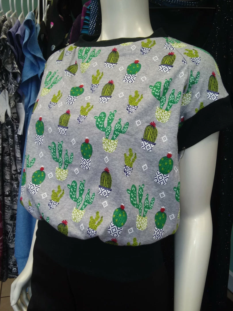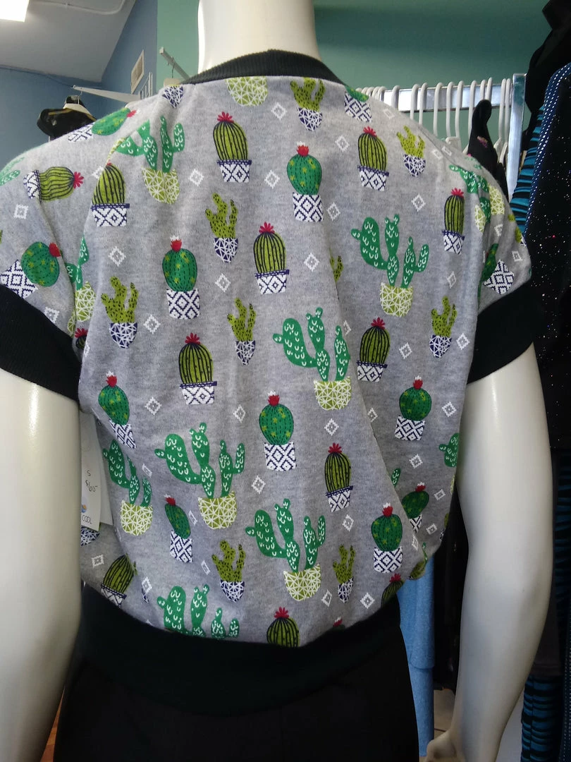 At the intersection of comfort and fashion, this fun pullover top in cactus jersey will step up your casual game. Made from soft grey jersey knit, finished with black ribbing. Easy care, machine wash cold.