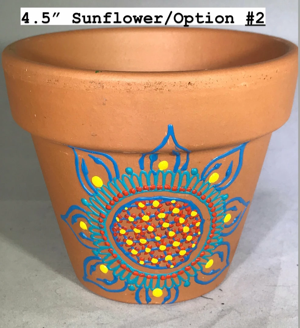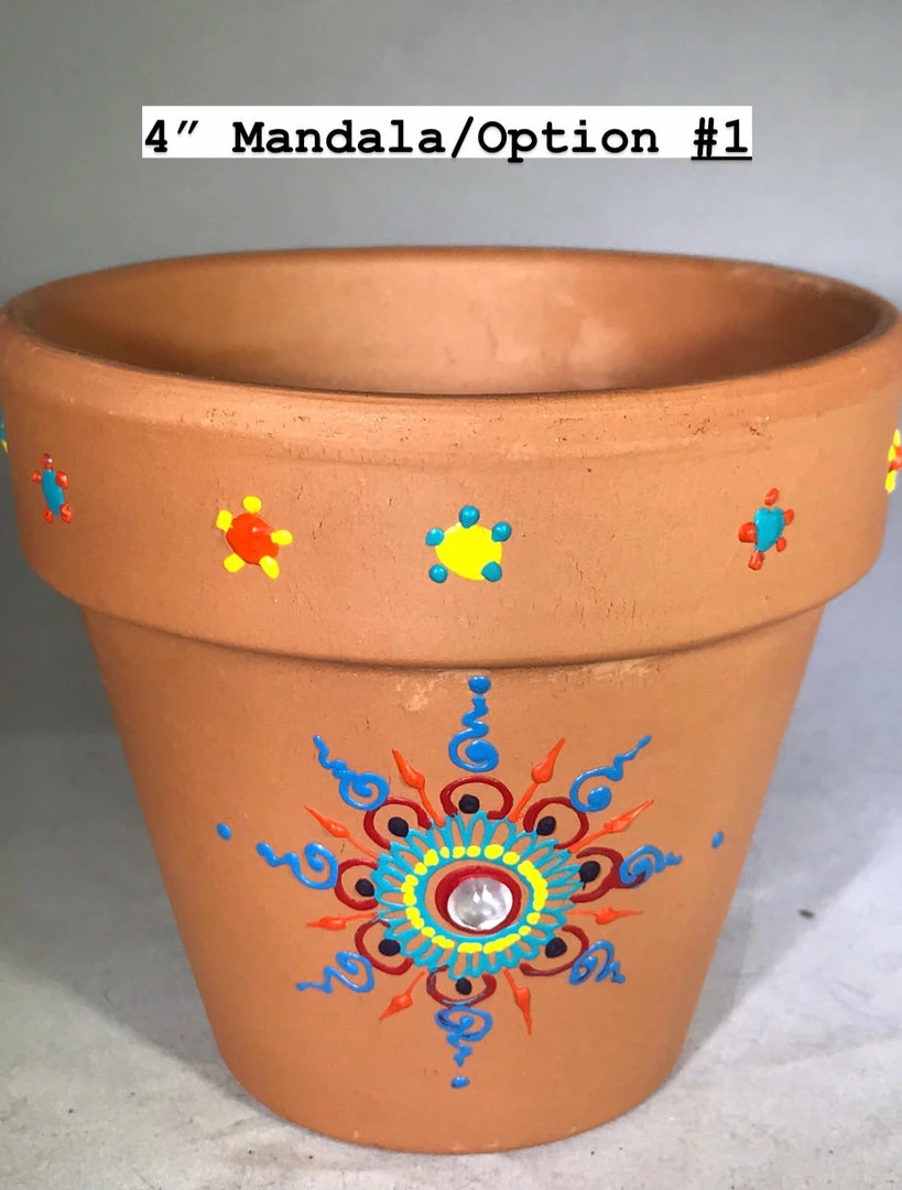 Hand painted terra cotta clay pots, with original henna designs applied in a rainbow of acrylic paint. Pots are heat sealed and suitable for indoor or outdoor use. A beautiful was to accent your plants, and a wonderful gift! Choose from 4″, 4.5″, and 6″ clay pots.