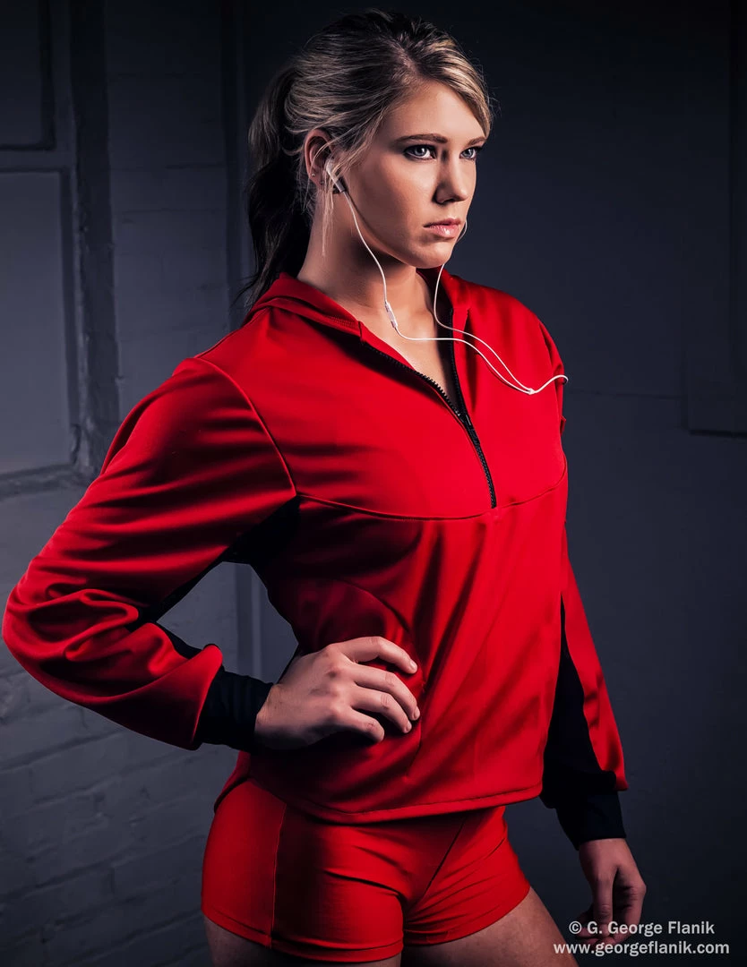 Hooded pullover in red performance knit, with black trim. Zip front. Available in other colors. Sportswear fabric is wicking, great for workouts!