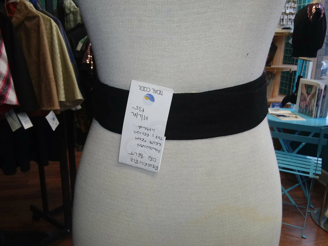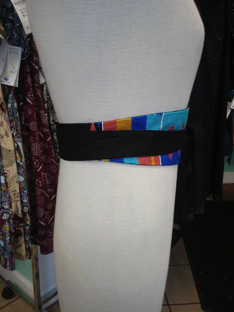These stylish Obi belts are a perfect addition to your favorite dress, tunic, or long cardigan. It is handmade with a bright African Kente cloth. These belts are 100% reversible and are made with a slip hole to slide the tie straight through for a more sleek fit. Worn around the waist, accentuate your curves and cinch your waist with the colorful side, or flip it for black. Kente is a handwoven textile made in Ghana. This piece was sourced directly from the artisan weaver in the Tofi Region in Ghana. All clothing is handmade in Cleveland, Ohio.