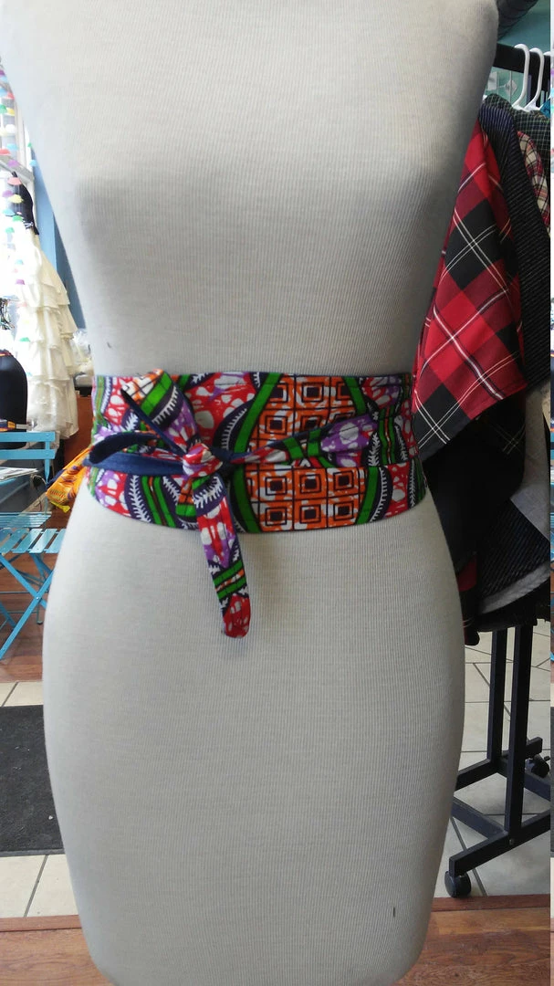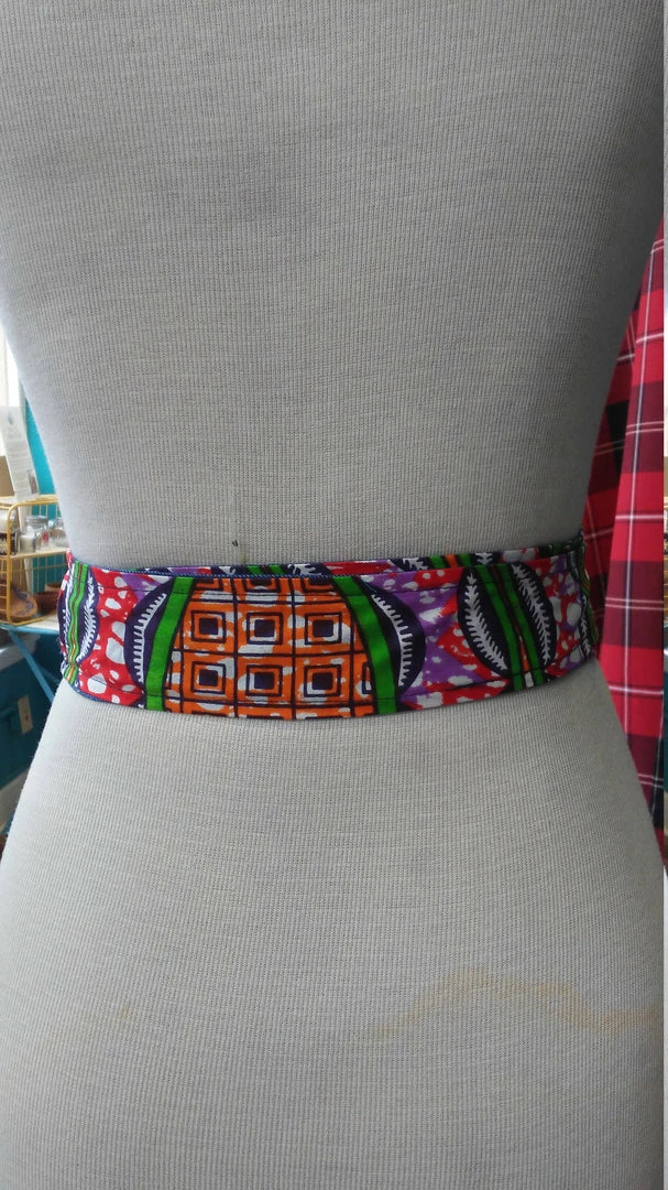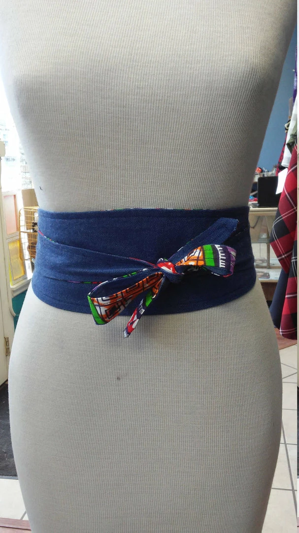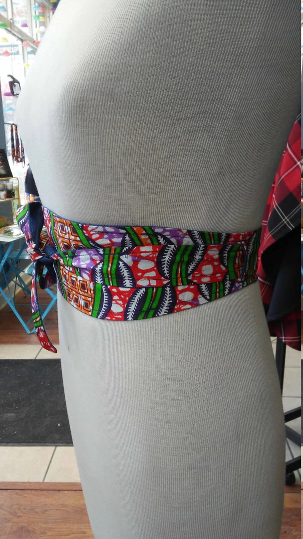 These stylish Obi belts are a perfect addition to your favorite dress, tunic, or long cardigan. It is handmade with a bright Ankara fabric from Africa. These belts are 100% reversible and are made with a slip hole to slide the tie straight through for a more sleek fit. Worn around the waist, accentuate your curves and cinch your waist with the colorful side, or flip it for a more professional look. This style fits sizes xs/sm/m.