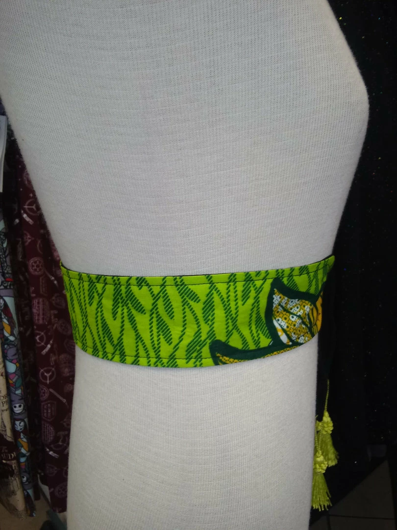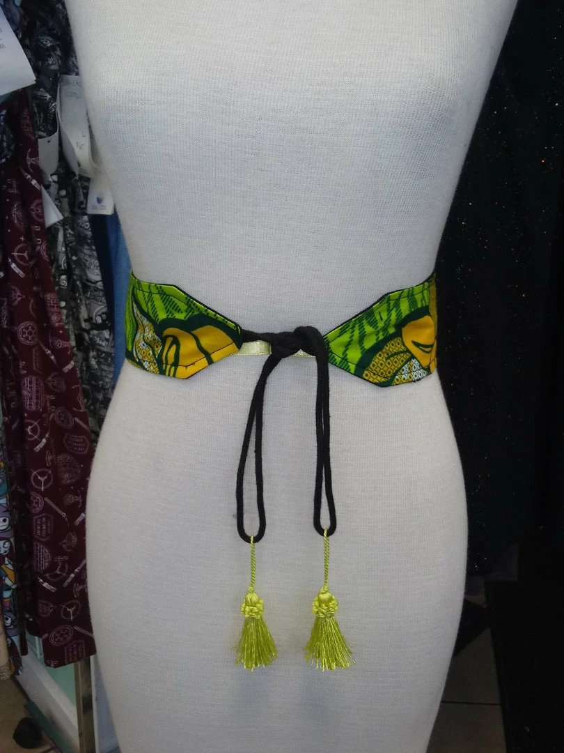 A stylish way to add some color to your wardrobe and accentuate your figure, this reversible belt features black linen and handmade ankara wax block cotton. Tie tassel front for an adjustable fit. African textiles sourced directly from Nigeria. Tassel belt created for the Lagoon 2019 Collection, Accra Fashion Week in Ghana.