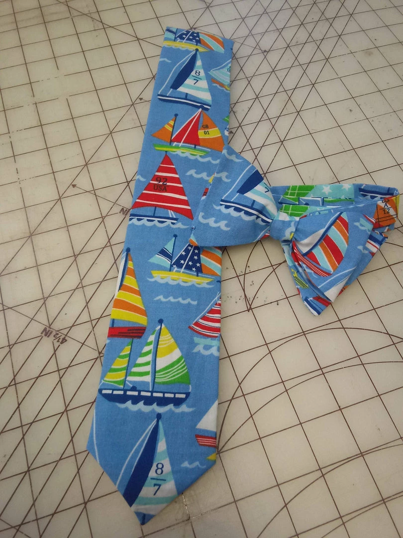 Sailboat necktie in bow tie, skinny tie, or standard tie styles, and kids or adult sizes. Adult Sailboat bow tie is self-tie, sized to 16.5″, custom length available at no charge. Kids Sailboat bow tie comes pre-tied, and has back elastic to allow it to slip over the head. Please see chart below for full necktie and bow tie sizing for children and adults.