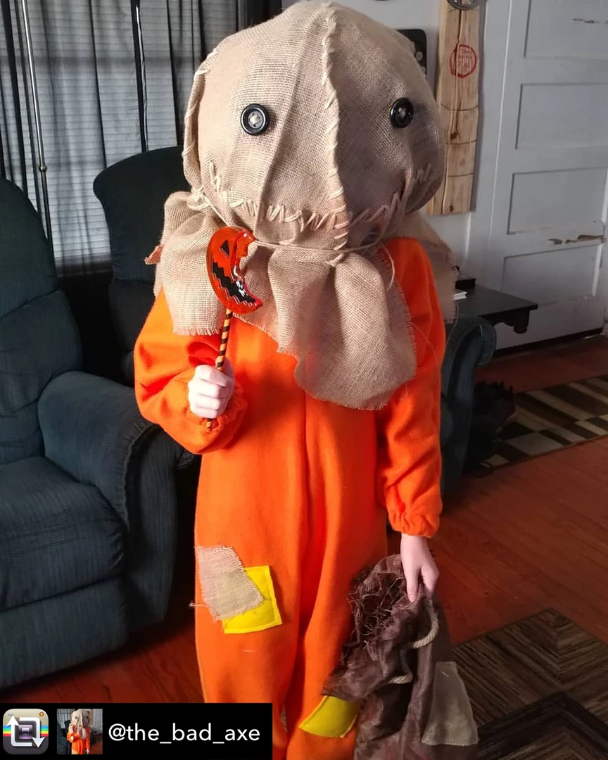 Trick r Treat Sam costume. Spread Halloween cheer in Samhain cosplay. Full Sam costume includes mask and jumpsuit, or order each individually. Sam’s head/mask is made from paper mache, with eye and breathing holes, and covered with burlap with eye buttons and stitching. Jumpsuit pajama is made from orange fleece, order by size or send me your measurements for customized fit. Standard jumpsuit has elastic bands for wrists and ankles, front zipper, and yellow and burlap patches on front. Can be made in any size, from kids to adult. For Trick r Treat Sam costume, please provide: general clothing size, chest, waist, hip, and inseam.