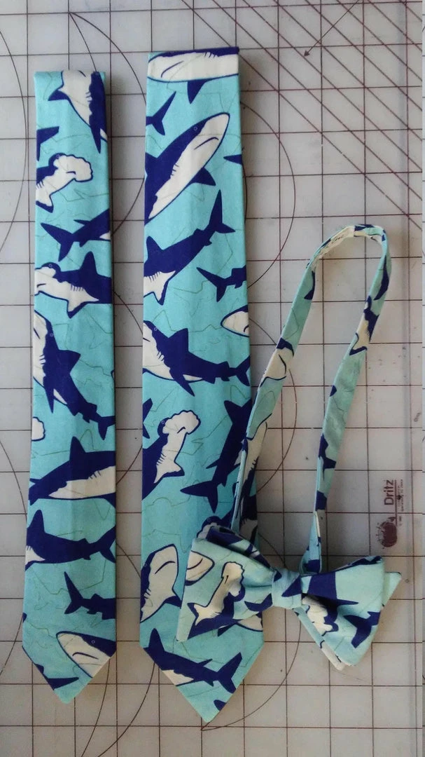 Great White and Hammerhead Shark necktie in bow tie, skinny tie, or standard tie styles, and kids or adult sizes. Adult Shark bow tie is self-tie, sized to 16.5″, custom length available at no charge. Kids Shark bow tie comes pre-tied, and has back elastic to allow it to slip over the head. Please see chart below for full necktie and bow tie sizing for children and adults.