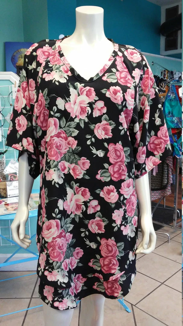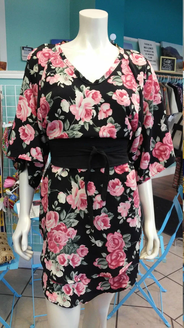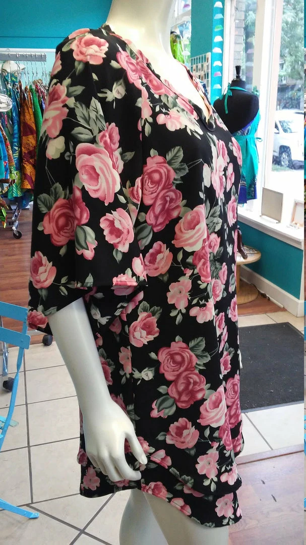 Flutter sleeve tunic dress, with raglan sleeve, bias neckline, and shirttail multi-layer hem. Made from vintage black floral fabric. Easy care, machine wash cold. Shown with Tidal Cool Obi belt, sold separately. Wear as a stand alone dress, or pair with leggings to extend the season. All clothing handmade in Cleveland, Ohio