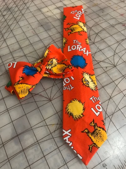 The Lorax Dr Seuss necktie in bow tie, skinny tie, or standard tie styles, and kids or adult sizes. Adult The Lorax Dr Seuss bow tie is self-tie, sized to 16.5″, custom length available at no charge. Kids The Lorax Dr Seuss bow tie comes pre-tied, and has back elastic to allow it to slip over the head. Please see chart below for full necktie and bow tie sizing for children and adults.