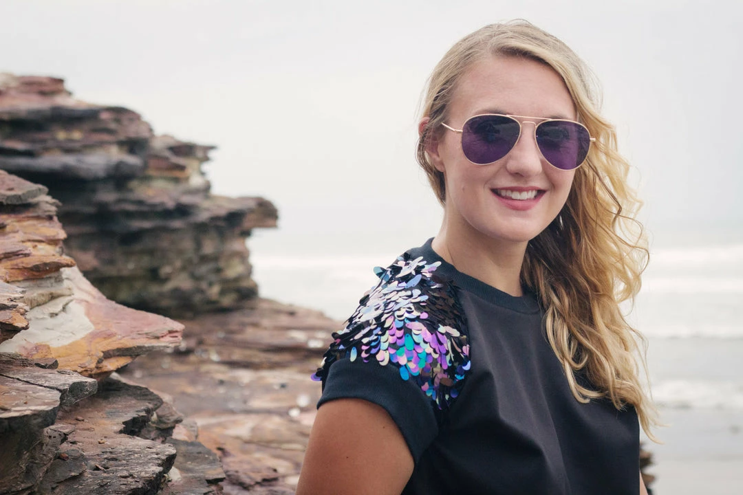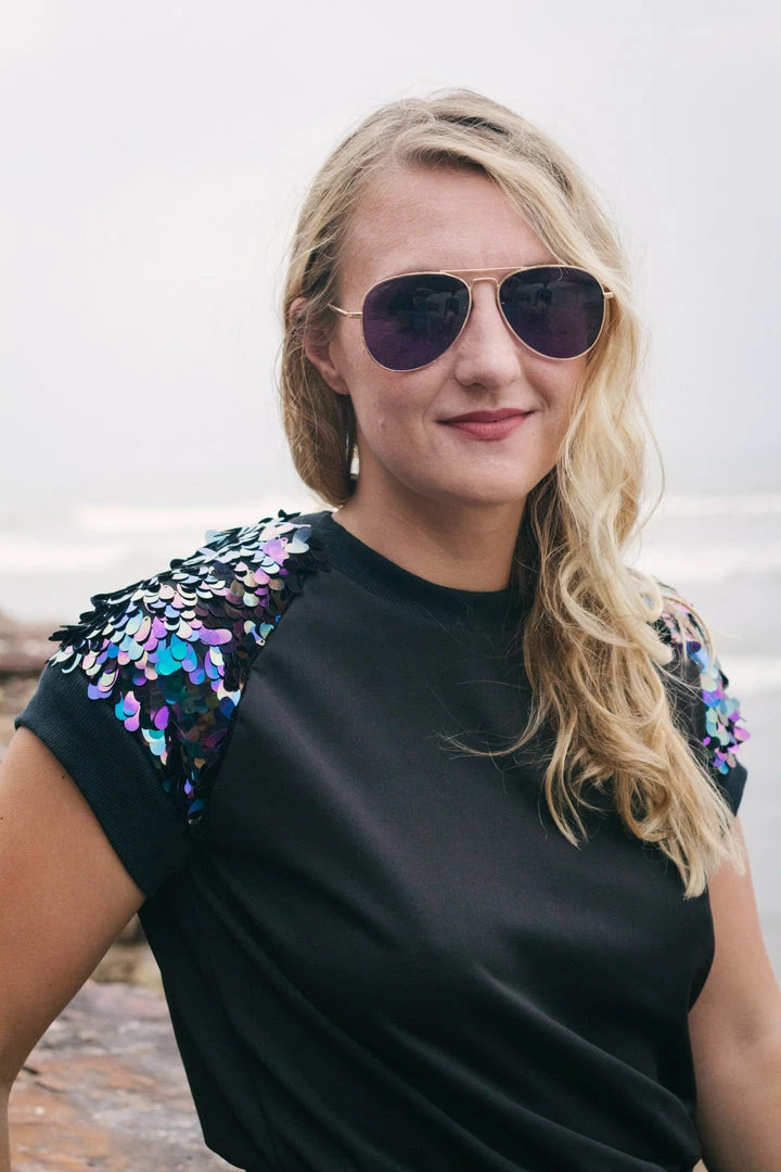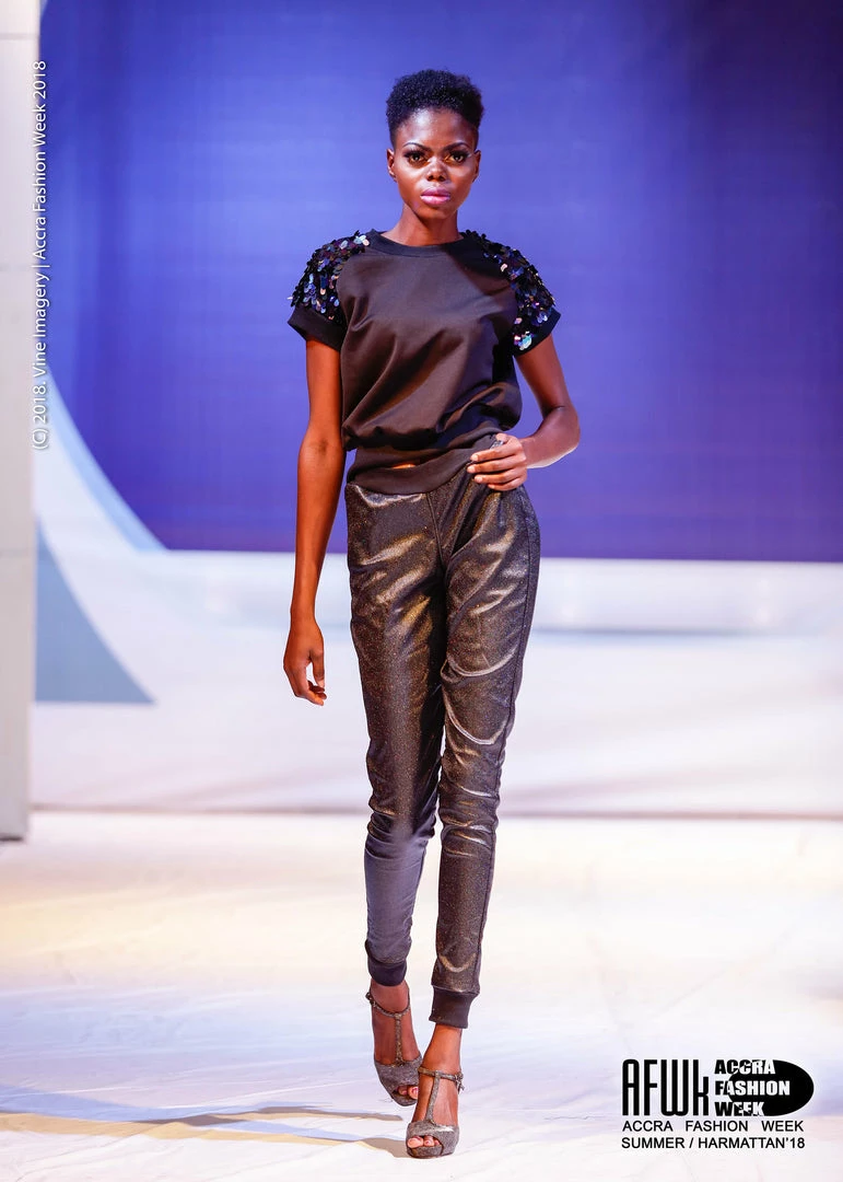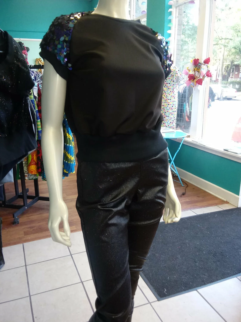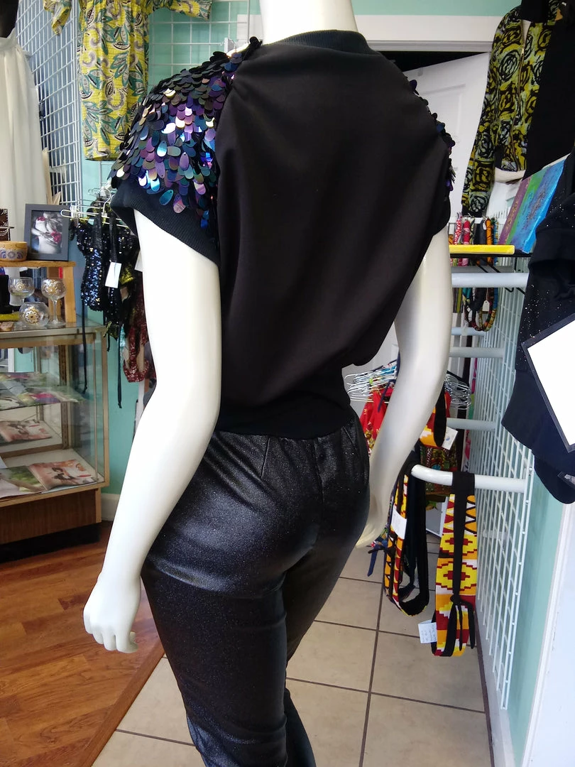 At the intersection of comfort and fashion, this versatile pullover shirt will step up your casual game, or bring an edge to your evening look. Made from lightweight black jersey knit, with raglan sleeves in oval iridescent sequin. The sleeves are fully lined, with all sequin seams enclosed for maximum comfort. Neck, sleeves and waist are finished with black cuff ribbing. Part of the Lagoon collection shown during Accra Fashion Week, joggers available separately. Easy care, machine wash cold, inside out, lie flat to dry.
