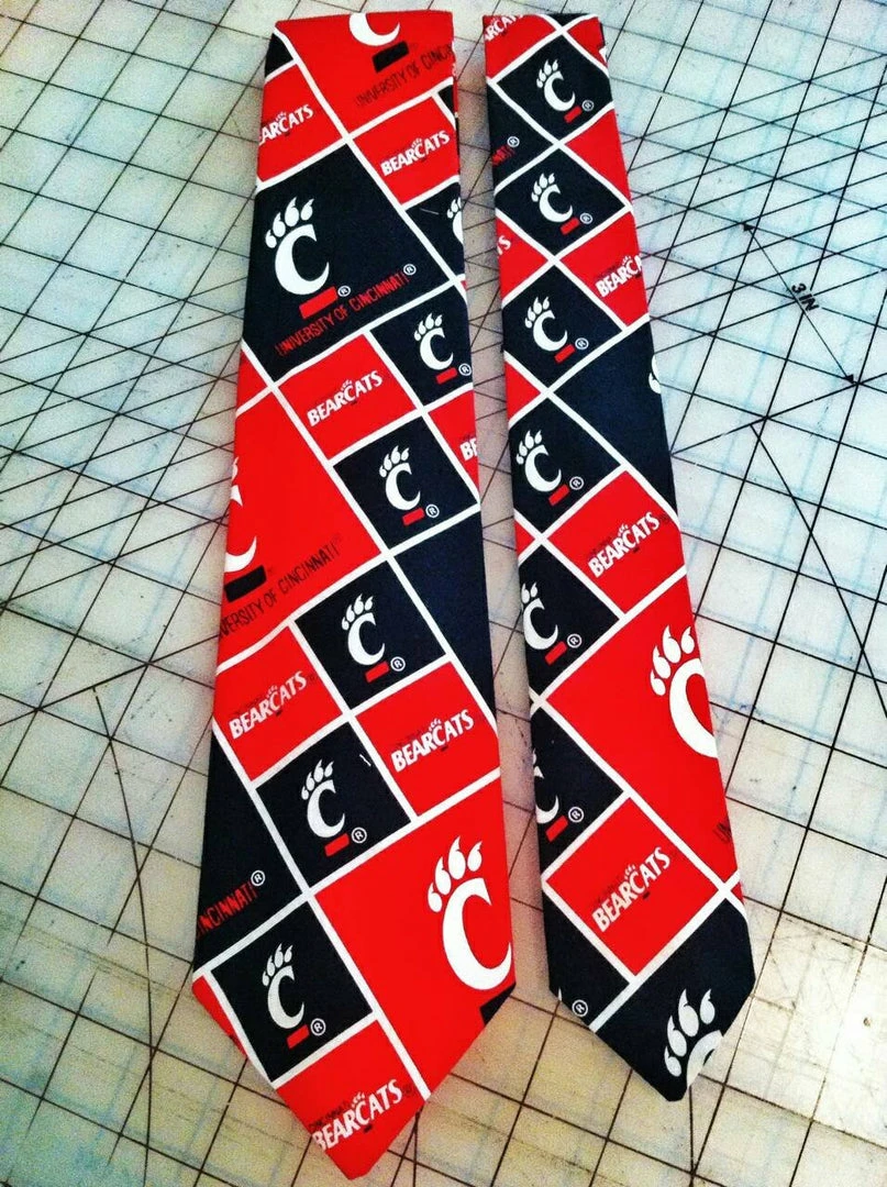 University of Cincinnati Bearcats necktie in bow tie, skinny tie, or standard tie styles, and kids or adult sizes. Adult University of Cincinnati Bearcats bow tie is self-tie, sized to 16.5″, custom length available at no charge. Kids University of Cincinnati Bearcats bow tie comes pre-tied, and has back elastic to allow it to slip over the head. Please see chart below for full necktie and bow tie sizing for children and adults.