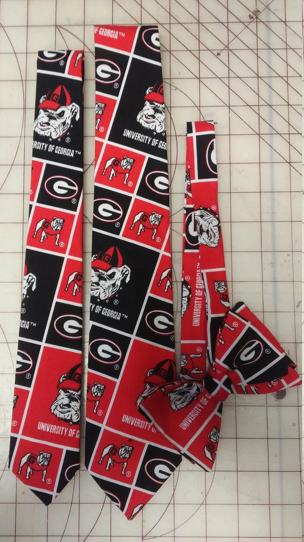 University of Georgia Bulldogs necktie in bow tie, skinny tie, or standard tie styles, and kids or adult sizes. Adult University of Georgia Bulldogs bow tie is self-tie, sized to 16.5″, custom length available at no charge. Kids University of Georgia Bulldogs bow tie comes pre-tied, and has back elastic to allow it to slip over the head. Please see chart below for full necktie and bow tie sizing for children and adults.