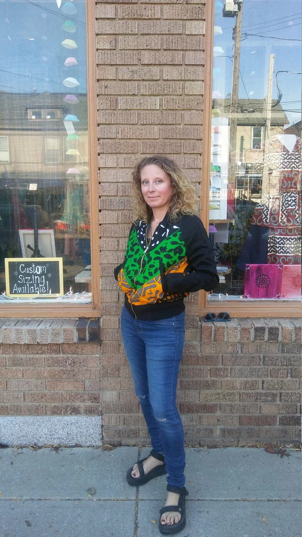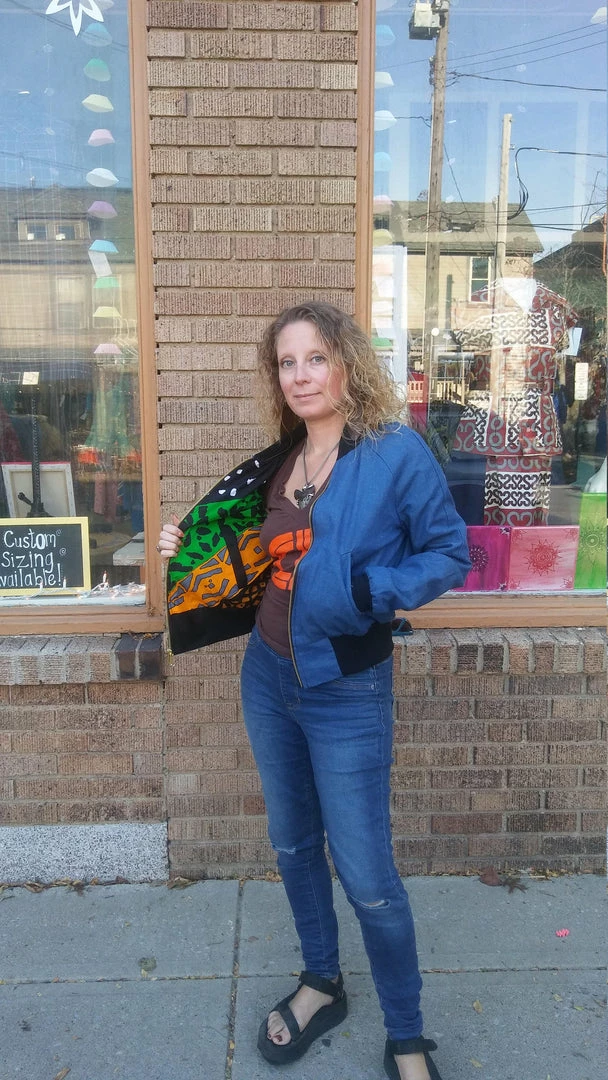 Reversible bomber in African wax block cotton in a mudcloth print. Reverses to solid midweight denim. Welt pockets on both sides. All clothing handmade in Cleveland, OH .