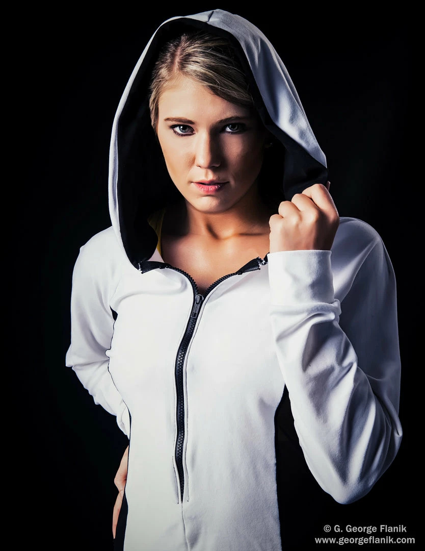 Hooded pullover in performance knit, in graphic white with black trim. Lined hood, zip front, and open mesh sides. Available in other colors. Sportswear fabric is wicking, great for workouts.